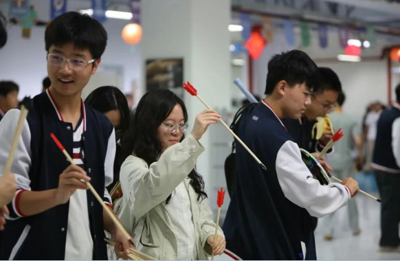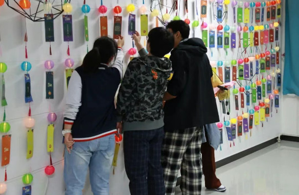 文化体验区,该区域设有灯谜长廊、诗词飞花令、投壶雅趣、趣味问答、珠行万里五项游戏。同学们自主选择喜爱的项目游玩,每答对一题即可赢得一枚积分章,集齐五枚印章能兑换礼品。大家踊跃参与,在欢乐游戏中体会中秋文化底蕴,同时拉近了同学间的距离。