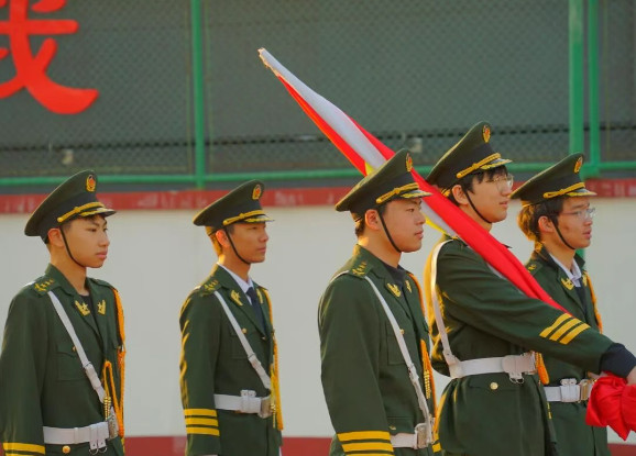 护旗手们整齐划一,斗志昂扬,国旗护卫队的队员们身着笔挺制服,步履坚定地走向旗杆。